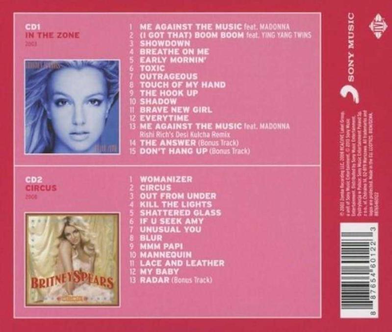 In The Zone 1-1 Me Against The Music 1-2 (I Got That) Boom Boom 1-3 Showdown 1-4 Breathe On Me 1-5 Early Mornin' 1-6 Toxic 1-7 Outrageous 1-8 Touch Of My Hand 1-9 The Hook Up 1-10 Shadow 1-11 Brave New Girl 1-12 Everytime 1-13 Me Against The Music (Rishi Rich's Desi Kulcha Remix) 1-14 The Answer 1-15 Don't Hang Up Circus 2-1 Womanizer 2-2 Circus 2-3 Out From Under 2-4 Kill The Lights 2-5 Shattered Glass 2-6 If U Seek Amy 2-7 Unusual You 2-8 Blur 2-9 Mmm Papi 2-10 Mannequin 2-11 Lace And Leather 2-12 My Baby 2-13 Radar 2013 DOUBLE CD AMBALAJINDADIR