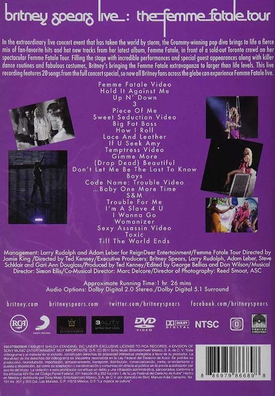 1 Femme Fatale Video 2 Hold It Against Me 3 Up N' Down 4 3 5 Piece Of Me 6 Sweet Seduction Video 7 Big Fat Bass 8 How I Roll 9 Lace And Leather 10 If U Seek Amy 11 Temptress Video 12 Gimme More 13 (Drop Dead) Beautiful 14 Don't Let Me Be The Last To Know 15 Boys 16 Code Name: Trouble Video 17 ...Baby One More Time 18 S&M 19 Trouble For Me 20 I'm A Slave 4 U 21 I Wanna Go 22 Womanizer 23 Sexy Assassin Video 24 Toxic 25 Till The World Ends 2010 KONSER DVD AMBALAJINDADIR
