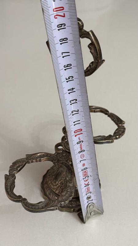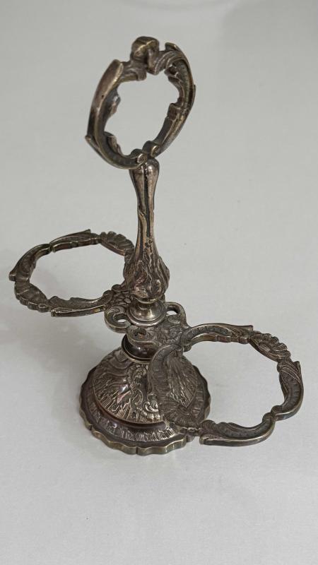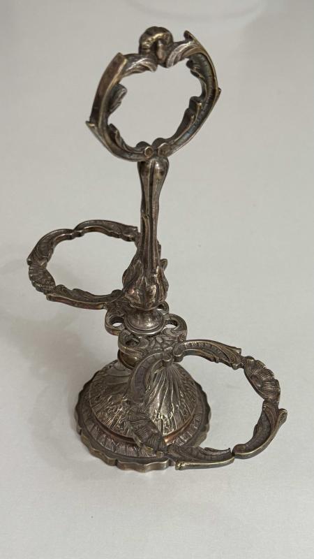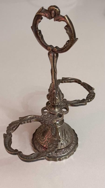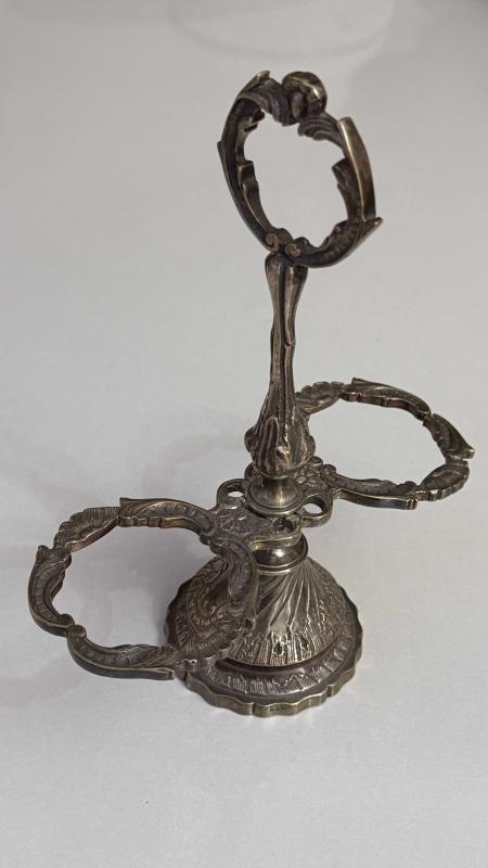 Zarif işlemelere sahip bu metal stand, dekoratif ve antika bir görünüme sahiptir. Oymalı detayları ve metalik parlaklığı ile dikkat çeker.