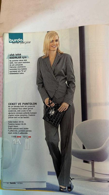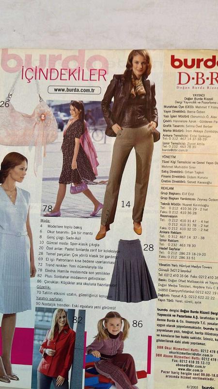 BURDA ELBİSE PATRONLU DERGİ - AĞUSTOS 2005 - MEHMET Y. YILMAZ – BERNA ÖZBEN – Ö. ALEV – HANNELORE AZRAK – GÜLDEREN PAMİR – SELMA ÖVET BERBER – İREM AKKAYA ZÜMBÜLYUVA – ERDAL İPEKEŞEN – ZİYNET ATTİLA – MEHMET MUHİDDİN SIRER – ORHAN TAŞKIN – DİDEM KURUCU – SERVET KAVASOĞLU – ELİF ERÜL – ZEYNEP ÖZDEM – NUSRET KIRIMLIOĞLU - ANNE ADAYLARINA GÜNÜN HER SAATİNE UYGUN MODELLER – ÇOCUKLAR İÇİN ANORAK VE KAZAKLAR – SEZONUN RENGİ – BEDEN BEDEN CEKET TAKIMLAR – DAVETLER İÇİN DANTEL BLUZ KOLEKSİYONU – OKUR TASARIMI MANTO – GENÇ ÇİZGİ: SADE-ASİL – GÜNCEL MODA: SPOR-KLASİK – PASTEL TONLARDA ZARİF KOLEKSİYON – TEMEL PARÇALAR – PATRONLARIN KISA BEDENE UYARLANMASI – TREND RENKLER: LİLA – HAMİLE MODASINDA YENİLİKLER – PLUS: SONBAHAR MODASI – ÇOCUKLAR ANAOKULUNA HAZIRLANIYOR – GÜZELLİK: TATİL ETKİSİNİ UZATIN – NOSTALJİK TRENDLER – DİKİŞ SÖZLÜĞÜ – DERİ KORSAJ 111 – PANTOLON 113 – RESİMLİ DİKİŞ KURSU 112 - TAM TAKIM 100 SAYFA adlı eser, Kitap > Süreli Yayınlar > Dergiler > Magazin, Moda kategorisinde İkinci El olarak satıştadır.