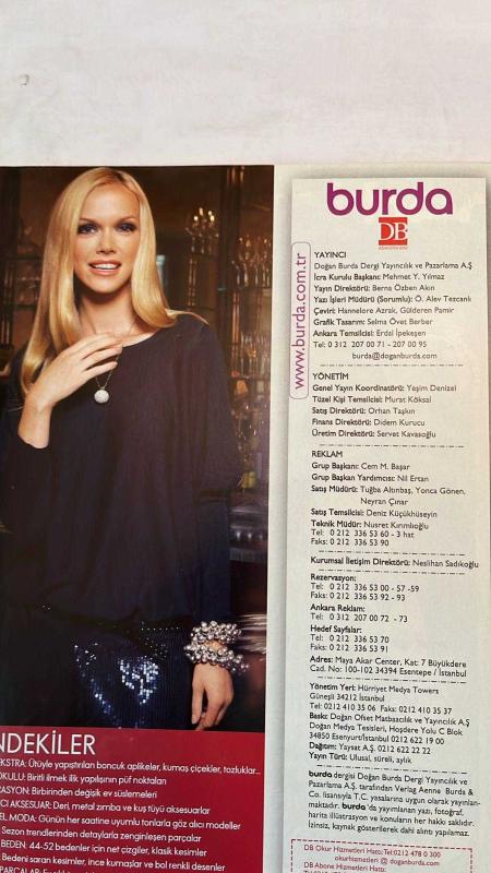 BURDA ELBİSE PATRONLU DERGİ - OCAK 2011 - MEHMET Y. YILMAZ – BERNA ÖZBEN AKIN – Ö. ALEV TEZCANLI – HANNELORE AZRAK – GÜLDEREN PAMİR – SELMA ÖVET BERBER – ERDAL İPEKEŞEN – YEŞİM DENİZEL – MURAT KÖKSAL – ORHAN TAŞKIN – DİDEM KURUCU – SERVET KAVASOĞLU – CEM M. BAŞAR – NIL ERTAN – TUĞBA ALTINBAŞ – YONCA GÖNEN – NEYRAN ÇINAR – DENİZ KÜÇÜKHÜSEYİN – NUSRET KIRIMLIOĞLU – NESLİHAN SADIKOĞLU - 40’LI YILLARDAN GÜNÜMÜZE - ŞİMDİ ÇILGINLIK ZAMANI - SİCACIK VE YUMUŞACIK KIŞ HALİ ŞIKLIĞI - LACİVERT ZAMANI - ELBİSEDEN MONTA - BÜYÜK BEDENLERE OFİS MODASI - DETAYLARDAKİ TRENDLER - ÜTÜYLE YAPIŞTIRILAN BONCUK APLİKELER - KUMAŞ ÇİÇEKLER - TOZLUKLAR - BİRİTLİ İLMEK İLİK YAPILIŞI - EV SÜSLEMELERİ - DERİ METAL ZIMBA KUŞ TÜYÜ AKSESUARLAR - GÜNÜN HER SAATİNE UYUMLU MODELLER - 44-52 BEDENLER İÇİN KLASİK KESİMLER - KOLYENİN YAPILIŞI - GÖZ ALICI BONCUKLAR - ELBİSE 103 - ELBİSE 104 - 92 SAYFA adlı eser, Kitap > Süreli Yayınlar > Dergiler > Magazin, Moda kategorisinde İkinci El olarak satıştadır.