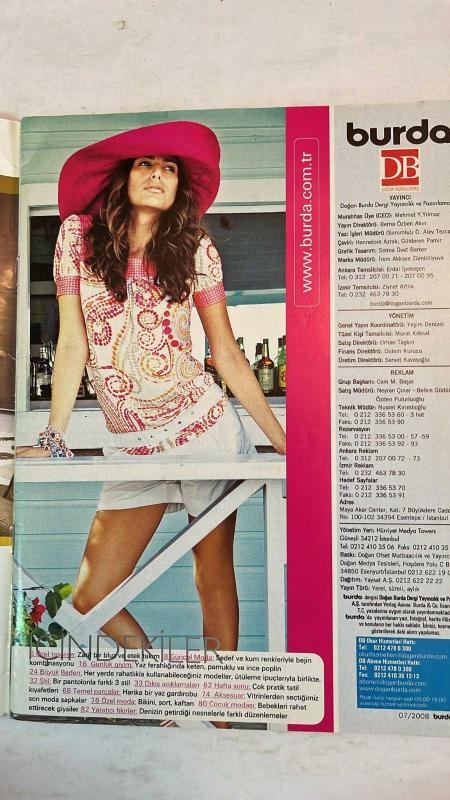 BURDA ELBİSE PATRONLU DERGİ - TEMMUZ 2008 MEHMET Y. YILMAZ – BERNA ÖZBEN AKIN – Ö. ALEV TEZCANLI – HANNELORE AZRAK – GÜLDEREN PAMİR – SELMA ÖVET BERBER – İREM AKKAYA ZÜMBÜLYUVA – ERDAL İPEKEŞEN – ZİYNET ATTİLA – YEŞİM DENİZEL – MURAT KÖKSAL – ORHAN TAŞKIN – DİDEM KURUCU – SERVET KAVASOĞLU – CEM M. BAŞAR – NEYRAN ÇINAR – BELKİS GÜDÜL – ÖZDEN PULURLUOĞLU – NUSRET KIRIMLIOĞLU TATİL KIYAFETLERİ – BİKİNİ – ŞORT – KAFTAN – KAPRİ PANTOLON – ASKILI BLUZ – VE YİNE SİYAH – BEBEK GİYSİLERİ – ÇOK ŞEKER ÇOK ŞİRİN – ANVELOP BLUZ VE ETEK – MERHABA YAZ – ZARİF BLUZ VE ETEK TAKIMI – SEDEF VE KUM RENKLERİ – KETEN – PAMUKLU – İNCE POPLİN – BÜYÜK BEDEN – ÜTÜLEME İPUÇLARI – BİR PANTOLONLA 3 STİL – DİKİŞ AÇIKLAMALARI – HAFTA SONU – TEMEL PARÇALAR – MODA ŞAPKALAR – ÇOCUK MODASI – YARATICI FİKİRLER – PHILIPS AZUR LONIC ÜTÜ – BLUZ – PANTOLON – ELBİSE – PERVAZ – FERMUAR – TELALI FORM BANDI – BİÇKİ PLANLARI – DUBLE PAÇA – BİRİT – CEP TORBASI – PLAKA VE PATRON PARÇALARI – DİKİŞ SIRALAMASI - TAM TAKIM 88 SAYFA adlı eser, Kitap > Süreli Yayınlar > Dergiler > Magazin, Moda kategorisinde İkinci El olarak satıştadır.