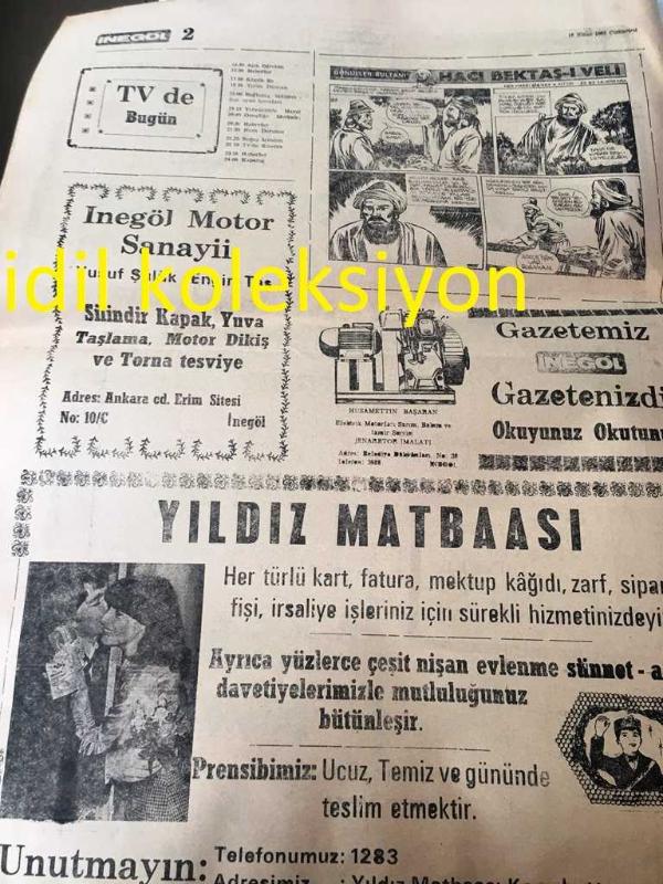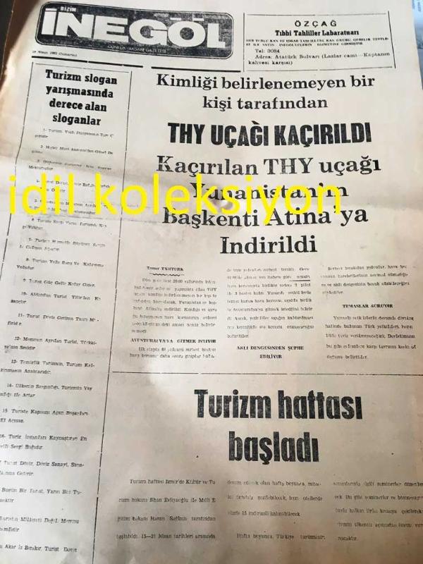 BURSA BİZİM İNEGÖL GAZETESİ YEREL TAŞRA BASINI---16 Nisan 1983 --Turizm slogan yarışmasında derece alan sloganlar --Kimliği belirlenemeyen bir kişi tarafından THY uçağı kaçırıldı kaçırılan THY uçağı Yunanistan 'ın Başkenti Atina 'ya İndirildi --Turizm Haftası Başladı --Gönüllerin Sultanı :Hacı Bektaş-ı Veli --Bir yazar :Halit Ziya Uşaklıgil Roman :Mavi ve Siyah --Satış İlanı -- Yıpranma, sararmalar, kupon kesiği ve yırtılmalar zamana bağlı olarak görülebilir.