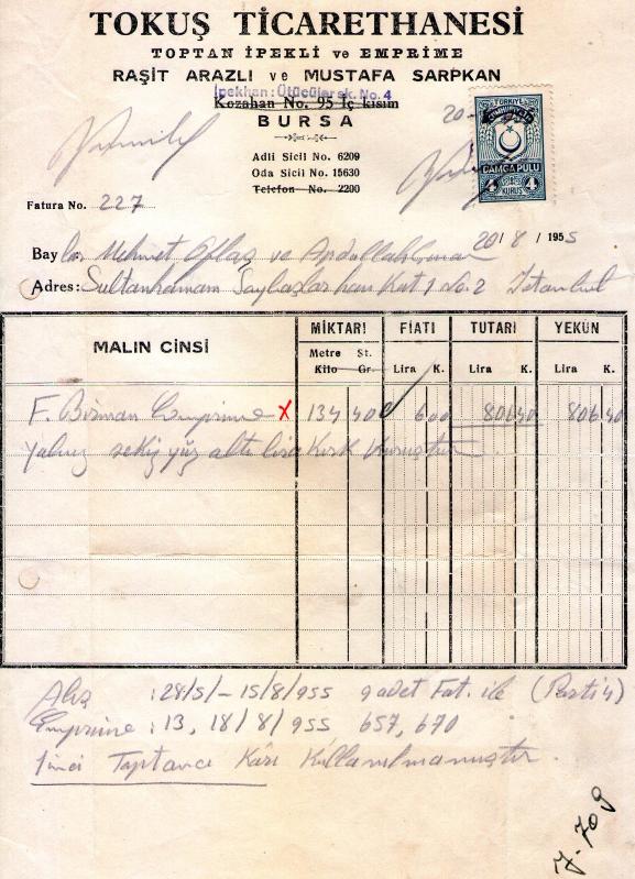 BURSA FATURA .1955 ....TOKUŞ TİCARET. RAŞİT ARAZLI. MUSTAFA SARPKAN .. MEHMET OFLAZ... ABDULLAH ÇINAR .. İSTANBUL, en son 5 ay önce güncellenmiştir.
