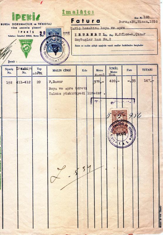 BURSA FATURA .1956 ....İPEKİŞ ANONİM ŞİRKETİ...MEHMET OFLAZ... ABDULLAH ÇINAR .. İSTANBUL, en son 5 ay önce güncellenmiştir.