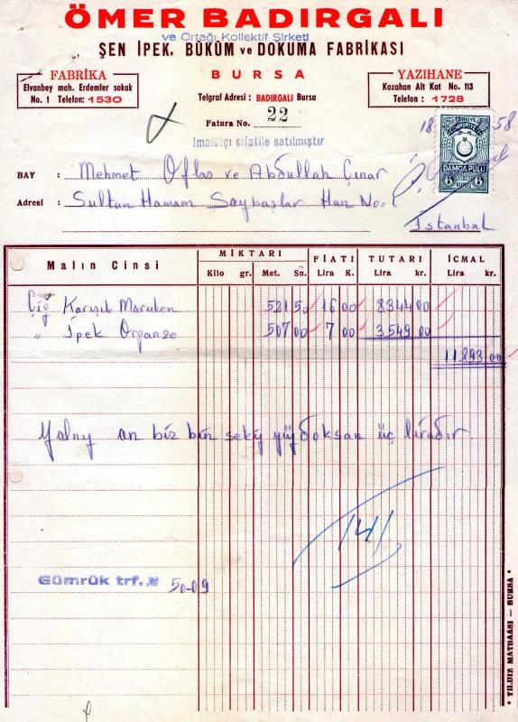 BURSA FATURA 1958 ÖMER BADIRGALI ŞEN İPEK...MEHMET OFLAZ... ABDULLAH ÇINAR, 2 yıl önce satışa sunulmuştur.