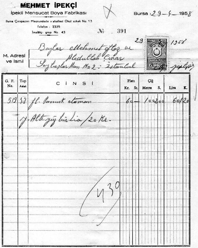 BURSA FATURA. BMEHMET İPEKÇİ 1958 MEHMET OFLAZ... ABDULLAH ÇINAR başlıklı ürün, Efemera, Müzik, Sinema > Belge ve Evraklar > Finansal Belge ve Evrak > Fatura kategorisi altında İkinci El olarak satılmaktadır.