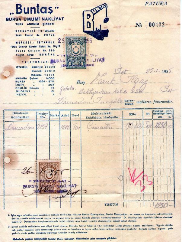 BURSA FATURA . .... BUNTAŞ 1955 NAKLİYAT .. MEHMET OFLAZ... ABDULLAH ÇINAR .. İSTANBUL, en son 5 ay önce güncellenmiştir.