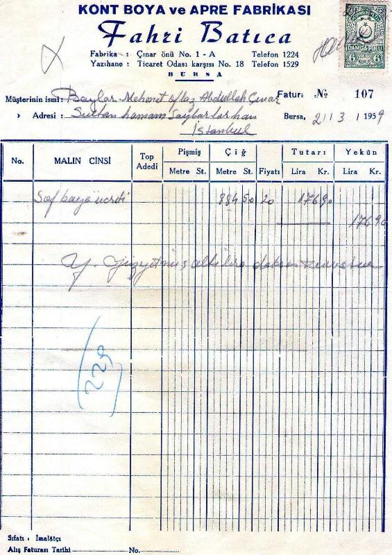 BURSA FATURA. FAHRİ BATICA KONT BOYA 1959 MEHMET OFLAZ... ABDULLAH ÇINAR
