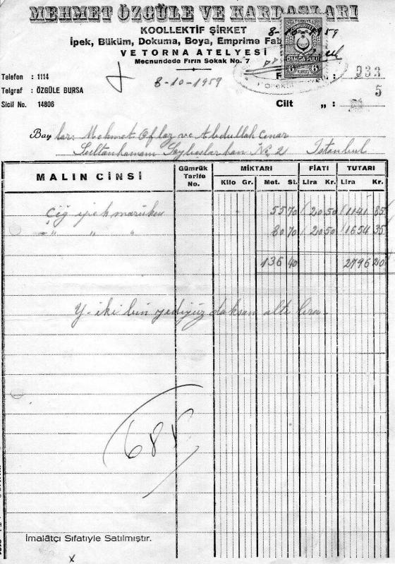 BURSA FATURA. MEHMET ÖZGÜLE VE KARDAŞLARI 1959................ MEHMET OFLAZ... ABDULLAH ÇINAR, en son 6 ay önce güncellenmiştir.