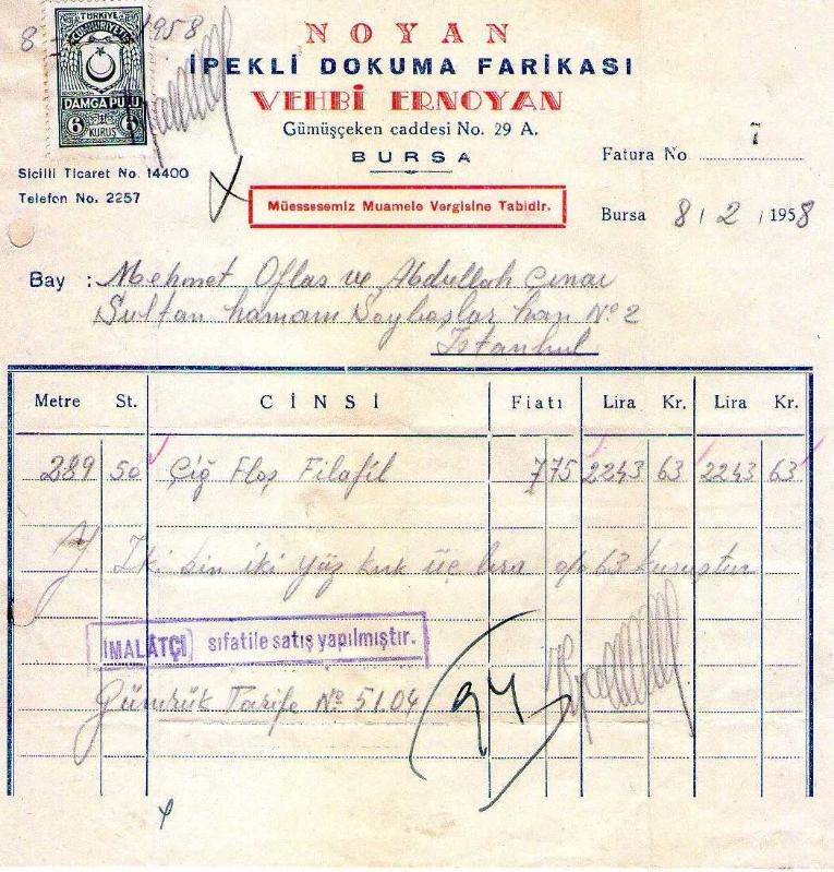 BURSA FATURA...................NOYAN İPEKLİ KUMAŞ FABRİKASI 1958...............MEHMET OFLAZ... ABDULLAH ÇINAR, 2 yıl önce satışa sunulmuştur.