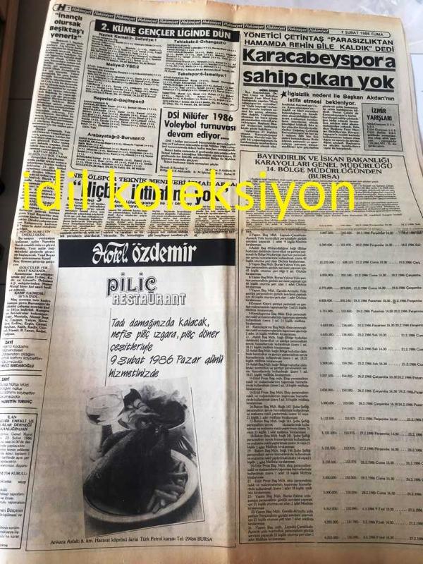 BURSA HAKİMİYET GAZETESİ YEREL TAŞRA BASINI - --- 7 Şubat 1986 --Evleri istimlak alanında kalanlar ANAP İl Merkezi 'ne Gitti --Çekirge Cabbar 'ın Korkunç İntikamı --Orhangazi SHP Örgütü Görev Bölümü Yaptı--Daha çok üretim daha büyük tesis---Destekleme fiyatları enflasyonun üstünde --Ümitler yine puan toplamaya başladı --Yönetici Çetintaş Parasızlıktan Hamamda Rehin Bile Kaldık Dedi " Karacabey Spor 'a sahip çıkan yok --TOTO 800 Bin Liraya Devretti --İnançlı Olursak Beşiktaş 'ı Yeneriz -- Yıpranma, sararmalar, kupon kesiği ve yırtılmalar zamana bağlı olarak görülebilir.