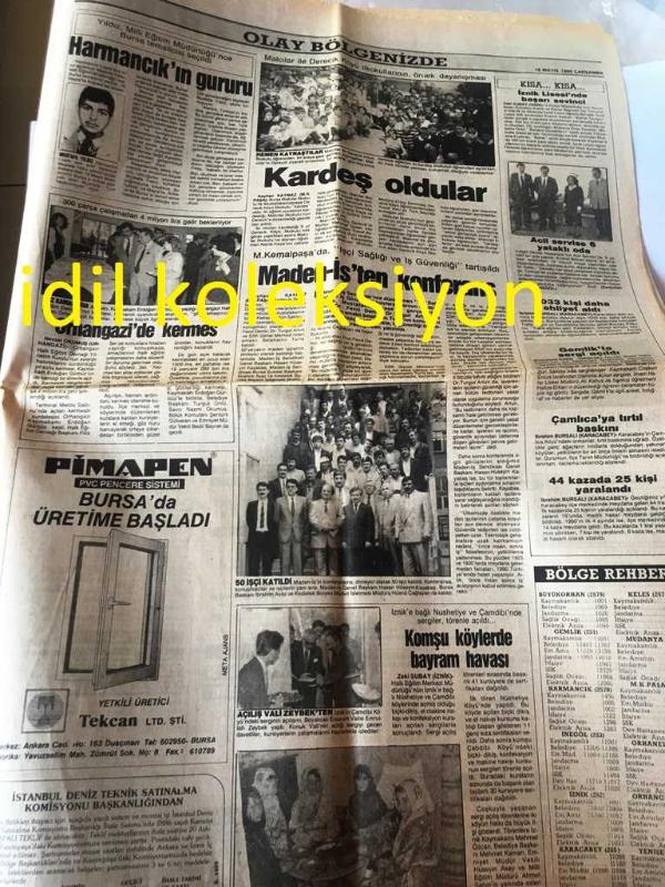 BURSA OLAY GAZETESİ YEREL TAŞRA BASINI---16 Mayıs 1990 --Sönmez den Eylem Çağrısı --Sporcuya Acı Son --Şahinoğlu dan hesap sordular --Haşimişcan altına yeni merkez planı --İlçe başkanlarından Tayan 'a tam destek ---Hububat Fiyatına Çiftçi Surat Astı --Aile bütünlüğüne devlet desteği--SHP 'liler Vali den Hesap Sordular -- Yıpranma, sararmalar, kupon kesiği ve yırtılmalar zamana bağlı olarak görülebilir.