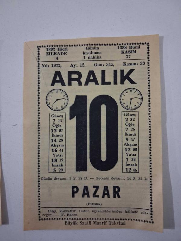 BÜYÜK SAATLİ MAARİF TAKVİMİ 10 Aralık 1972 Pazar - TAKVİM YAPRAĞI, en son 6 gün önce güncellenmiştir.