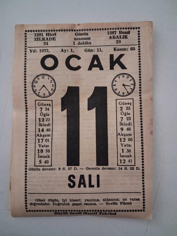 BÜYÜK SAATLİ MAARİF TAKVİMİ 11 Ocak 1972 Salı - TAKVİM YAPRAĞI, en son dün güncellenmiştir.