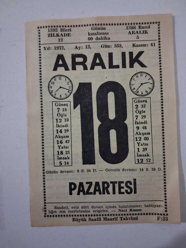 BÜYÜK SAATLİ MAARİF TAKVİMİ 18 Aralık 1972 Pazartesi - TAKVİM YAPRAĞI, en son 6 gün önce güncellenmiştir.