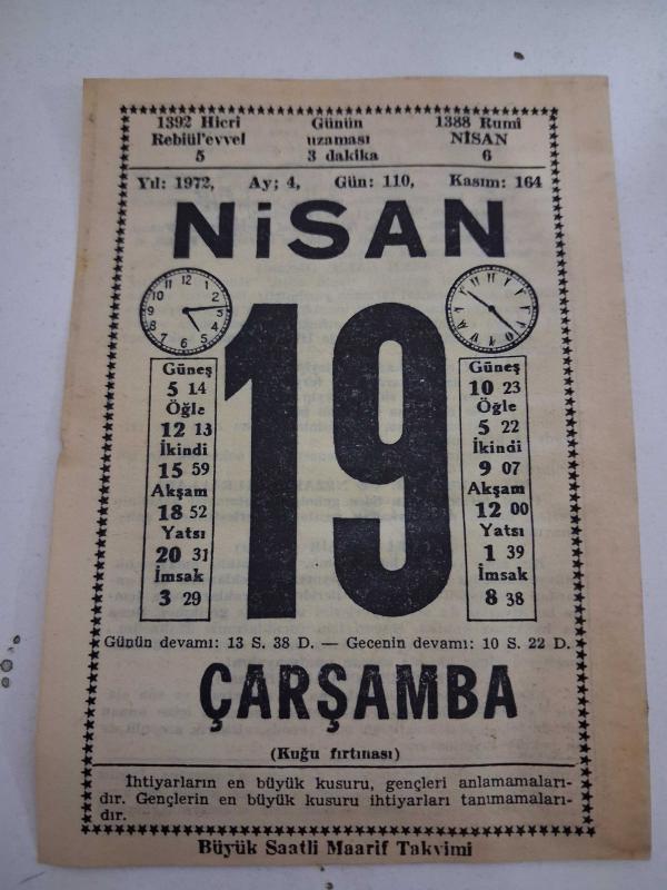 BÜYÜK SAATLİ MAARİF TAKVİMİ 19 Nisan 1972 Çarşamba - TAKVİM YAPRAĞI, en son 15 gün önce güncellenmiştir.
