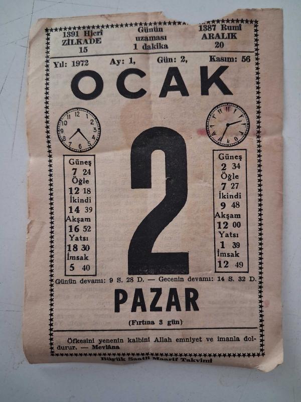 BÜYÜK SAATLİ MAARİF TAKVİMİ 2 Ocak 1972 Pazar - TAKVİM YAPRAĞI, en son dün güncellenmiştir.