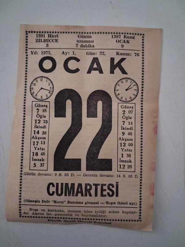 BÜYÜK SAATLİ MAARİF TAKVİMİ 22 Ocak 1972 Cumartesi - TAKVİM YAPRAĞI, en son dün güncellenmiştir.