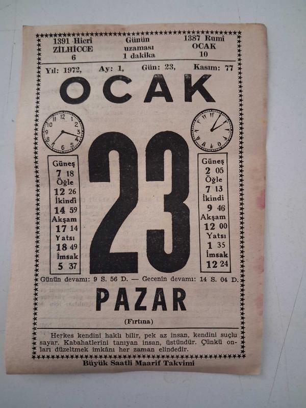 BÜYÜK SAATLİ MAARİF TAKVİMİ 23 Ocak 1972 Pazar - TAKVİM YAPRAĞI, en son dün güncellenmiştir.