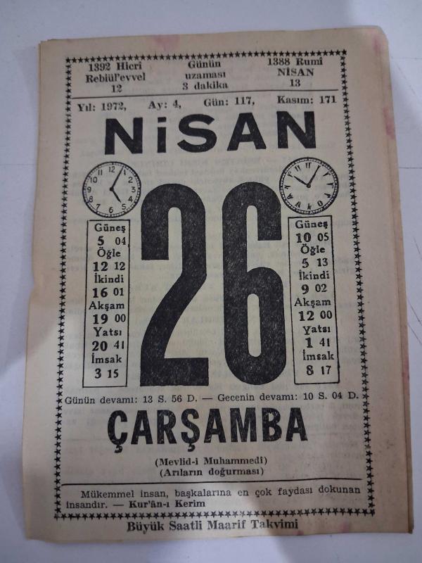 BÜYÜK SAATLİ MAARİF TAKVİMİ 26 Nisan 1972 Çarşamba - TAKVİM YAPRAĞI, en son 15 gün önce güncellenmiştir.