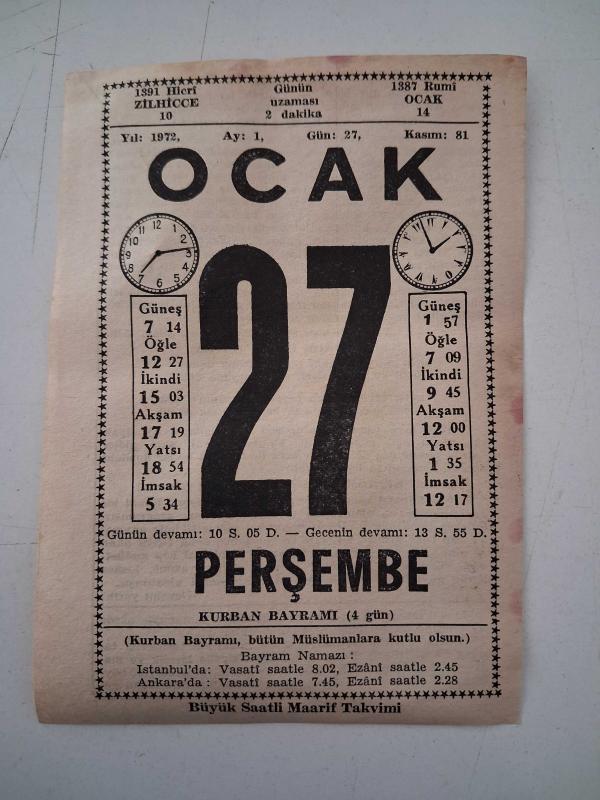 BÜYÜK SAATLİ MAARİF TAKVİMİ 27 Ocak 1972 Perşembe - TAKVİM YAPRAĞI, en son dün güncellenmiştir.