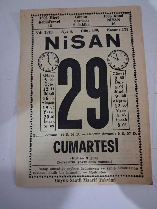 BÜYÜK SAATLİ MAARİF TAKVİMİ 29 Nisan 1972 Cumartesi - TAKVİM YAPRAĞI, en son 14 gün önce güncellenmiştir.