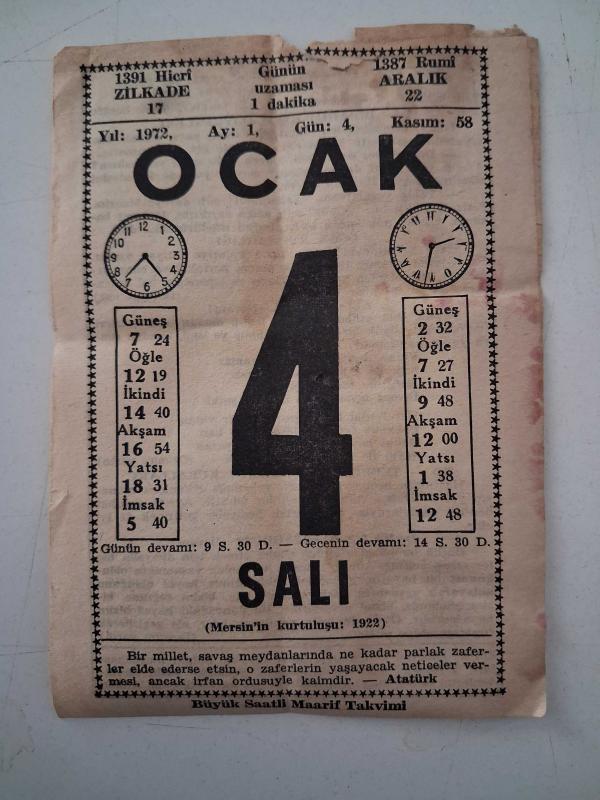 BÜYÜK SAATLİ MAARİF TAKVİMİ 4 Ocak 1972 Salı - TAKVİM YAPRAĞI, en son dün güncellenmiştir.