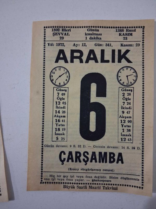 BÜYÜK SAATLİ MAARİF TAKVİMİ 6 Aralık 1972 Çarşamba - TAKVİM YAPRAĞI, en son 9 gün önce güncellenmiştir.