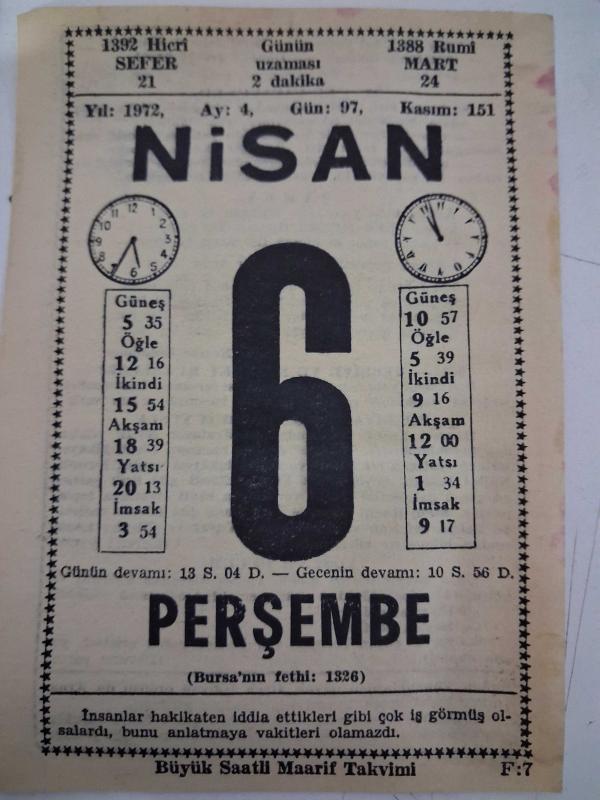 BÜYÜK SAATLİ MAARİF TAKVİMİ 6 Nisan 1972 Perşembe - TAKVİM YAPRAĞI, en son 12 gün önce güncellenmiştir.