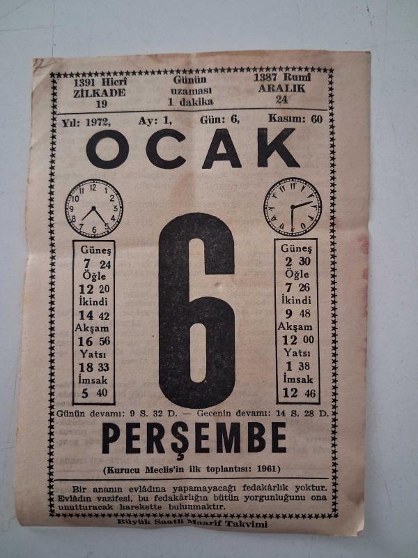 BÜYÜK SAATLİ MAARİF TAKVİMİ 6 Ocak 1972 Perşembe - TAKVİM YAPRAĞI, en son dün güncellenmiştir.