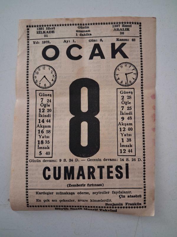 BÜYÜK SAATLİ MAARİF TAKVİMİ 8 Ocak 1972 Cumartesi - TAKVİM YAPRAĞI, en son dün güncellenmiştir.