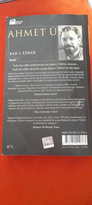 "Ahmet Ümit'ın son romanı, Bab-ı Esrar... Yaşamı, aşkı ve inancı yeniden düşünmek için… Yedi yüz yıldır çözülemeyen sır; Şems-i Tebrizi cinayeti... Yedi yüz yıldır süren bir sevda; Şems-i Tebrizi ile Mevlânâ Bab-ı Esrar sadece bir gerilim romanı değil, aynı zamanda bir sırlar kitabı. Fantastik öğeleri kullanarak çok katmanlı bir dil yaratan Ahmet Ümit bu yapıtında Mevlevilik temelinde din ve inanç üzerine ilginç sorular soruyor. Din ile aşk arasında, inanç ile sevda arasındaki ilişkiyi bambaşka bir açıdan gözlerimizin önüne seriyor. Dünyayı, yaşamı, inancı ve aşkı, yeniden düşünmemiz, yeniden araştırmamız, yeniden okumamız için... "
