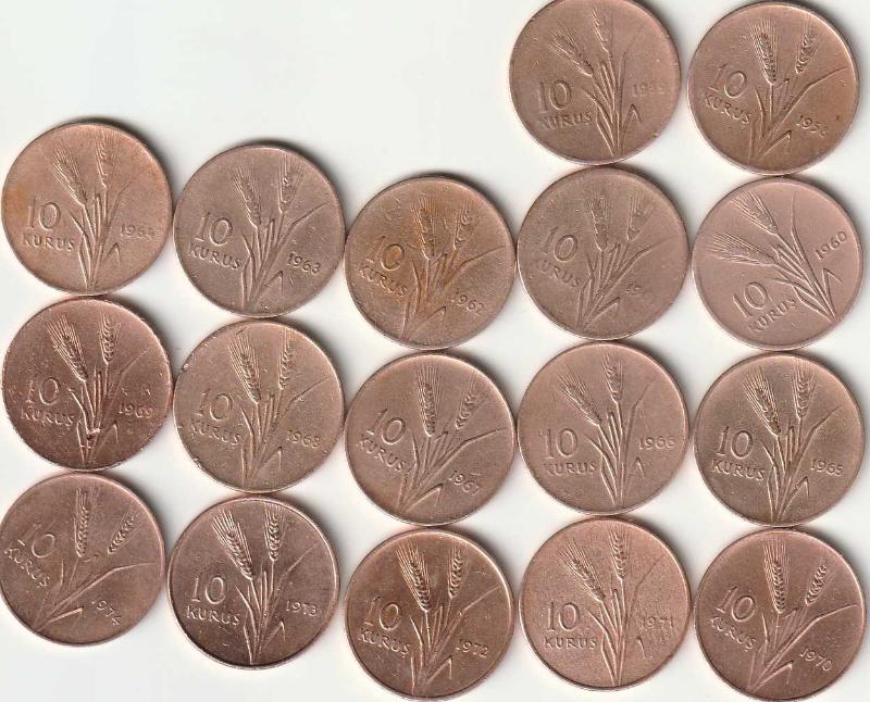 Bakır 10 Kuruş Lotu 1958-1974 arası eksiksiz Paraların her biri ÇÇT, ÇT+ durumundadır. Resimden detayları görebilirsiniz