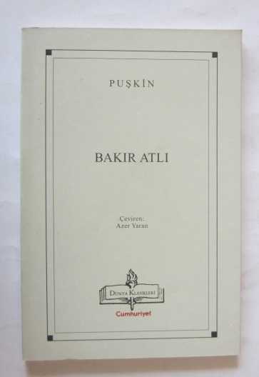 Bakır Atlı, Puşkin tarafından kaleme alınmıştır. Kitap 2000 yılında Cumhuriyet tarafından [İstanbul] yayınlanmıştır. Bu baskının çevirisi Azer Yaran tarafından yapılmıştır. 107 sayfadır. Bakır Atlı adlı eser Türkçe dilindedir.