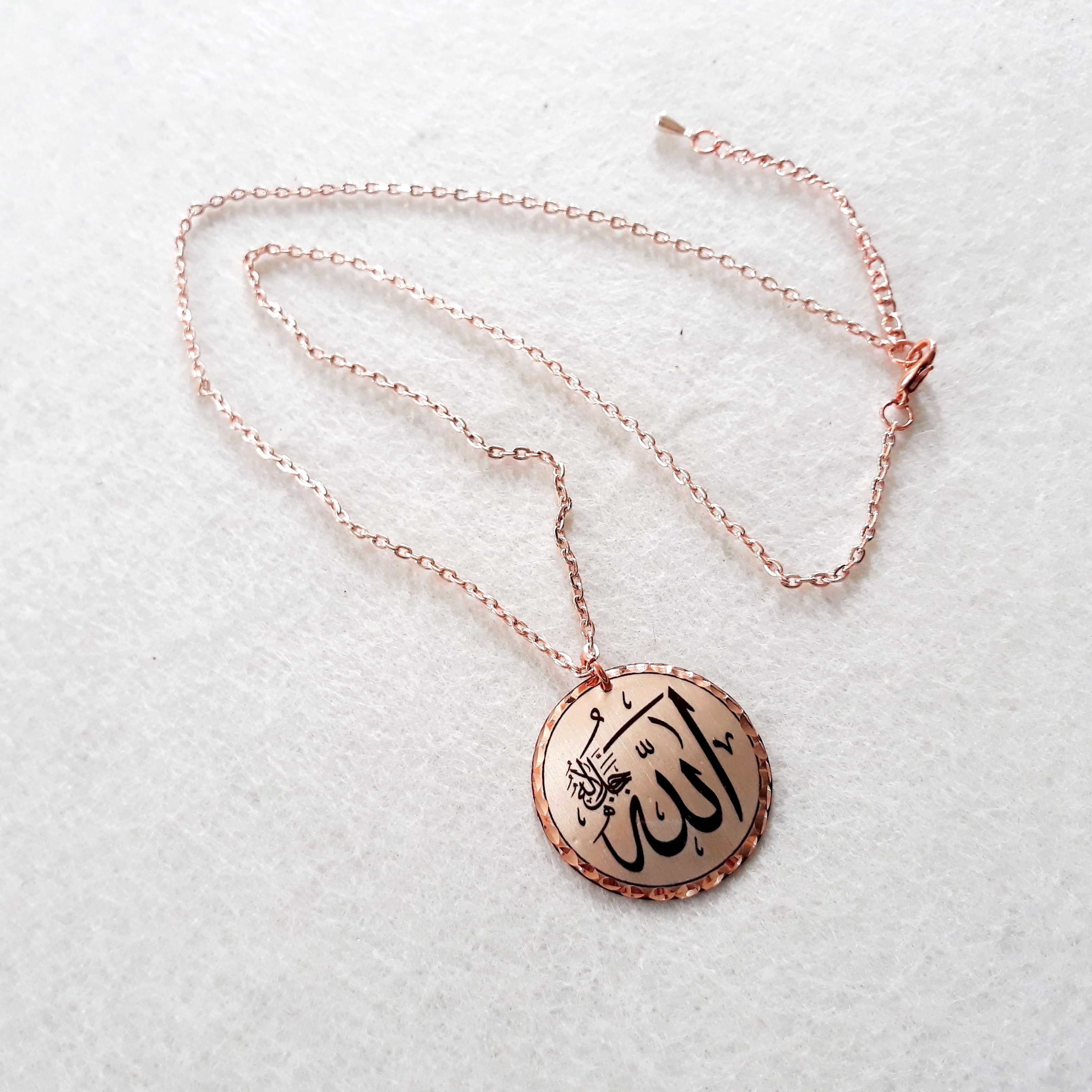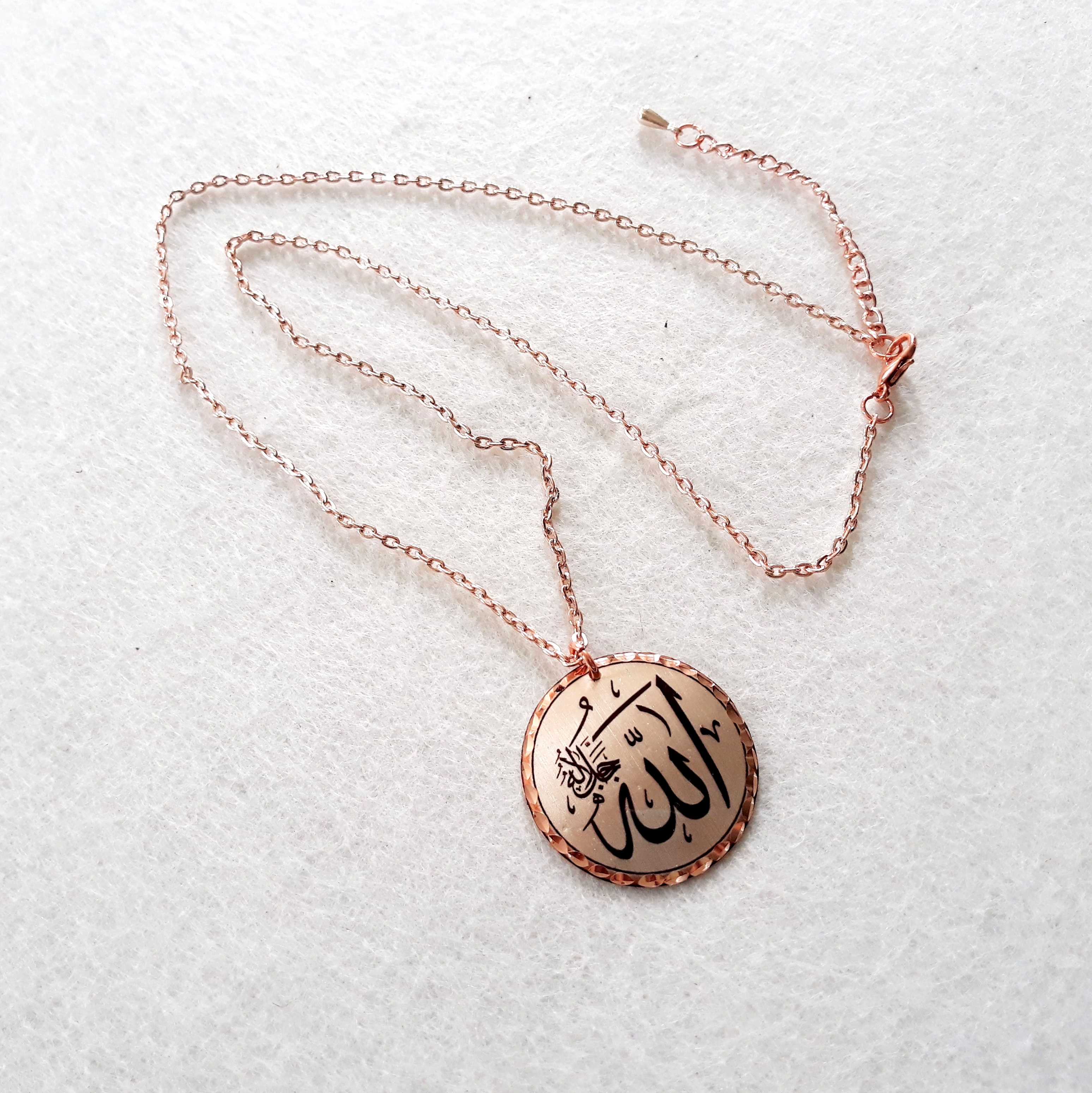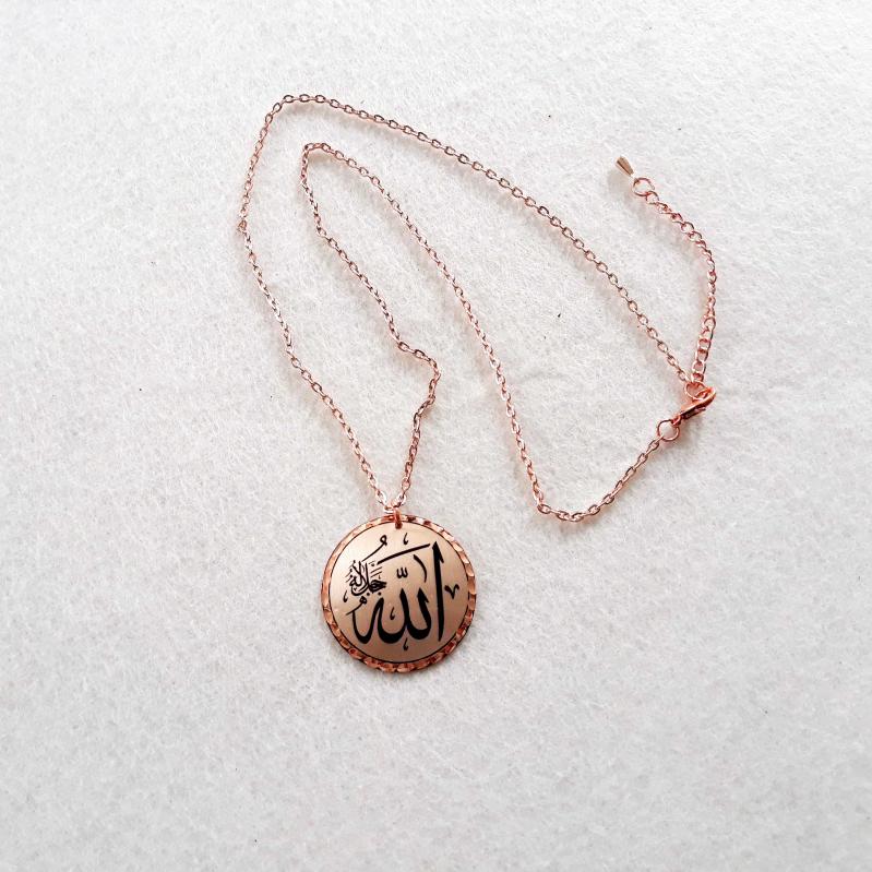 Bakır Elişçilikli Kolye. Arapça hat yazısıyla Allah yazılıdır. Üzeri gümüşlüdür. ALM-1, en son 2 gün önce güncellenmiştir.