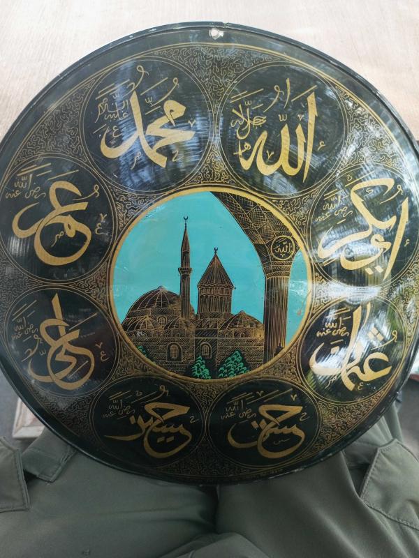 Bakır Rölyef Üzerine el çekme ile yazılmış Allah,Muhammed,Ali-çap 30 cm, en son 6 ay önce güncellenmiştir.