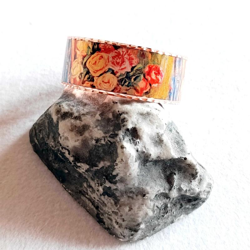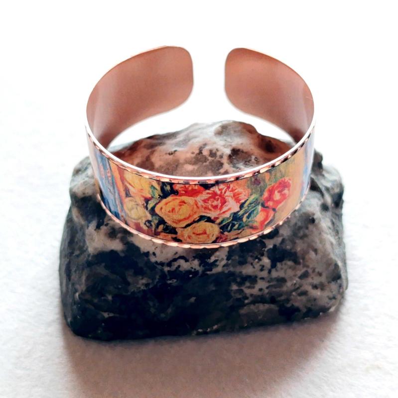 Bakır el işçilikli lüks bilezik - Tablolar Serisi Renoir - Glasses of Flowers-Vazodaki Güller 1908 başlıklı antika/koleksiyon objesi Türkiye menşe’lidir. 2000 ve sonrası dönemine aittir.