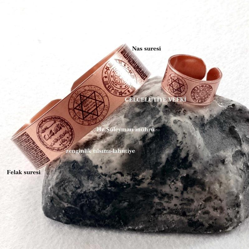 Bakır el işçilikli lüks bilezik ve yüzük set - süleyman mührü,celcelütiye, felak suresi,nas suresi,zenginlik tılsımı lahutiye yazılı başlıklı antika/koleksiyon objesi Türkiye menşe’lidir. 2000 ve sonrası dönemine aittir.
