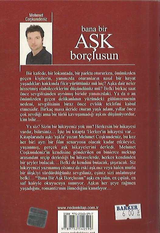 Kitap 2005 yılında Neden Kitap tarafından yayınlanmıştır. 174 sayfadır. Bana Bir Aşk Borçlusun adlı eser Türkçe dilindedir.