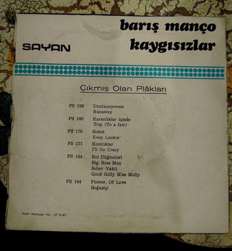 Barış Manço ve Kaygısızlar; A) 1. Kol Düğmeleri 2. Big Boss Man B) 1. Seher Vakti 2. Good Golly Miss Molly Barış Manço'nun aranan nadir plaklarından. Kırmızı göbek etiketi ile Sayan firmasından çıkmış. Kapak dönem baskı, ve çok iyi durumda. Plak 7.5++++. Kendi koleksiyon ürünüm.