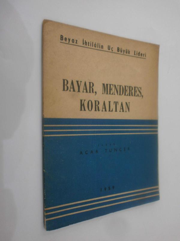 Bayar, Menderes, Koraltan / Beyaz İhtilalin Üç Büyük Lideri, Acar Tuncer tarafından kaleme alınmıştır. Kitap 1959 yılında yayınlanmıştır. 24 sayfadır. Bayar, Menderes, Koraltan / Beyaz İhtilalin Üç Büyük Lideri adlı eser Türkçe dilindedir.