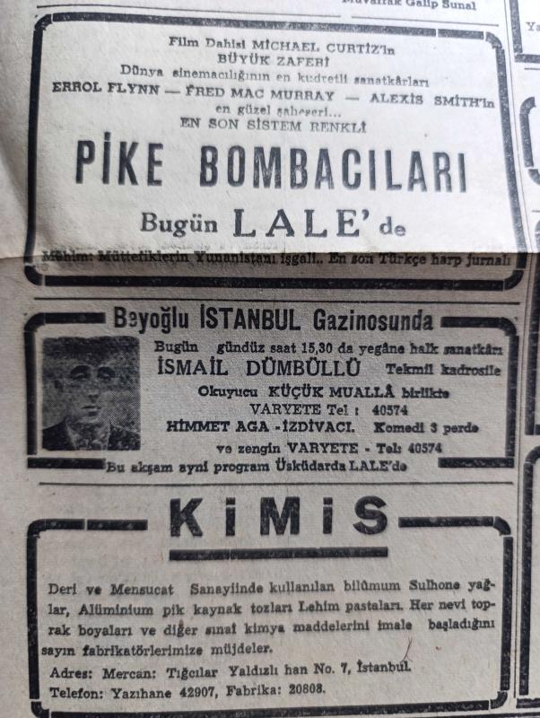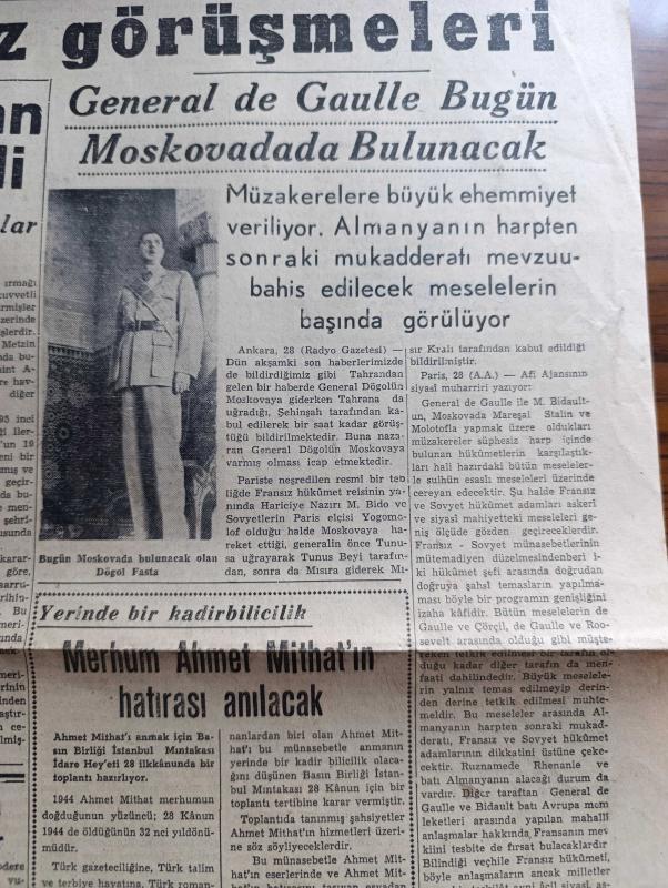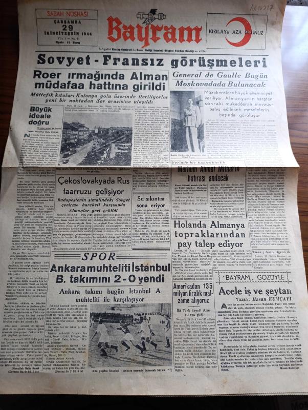 Bayram Gazetesi - 29 İkinciteşrin (Kasım) 1944 - büyük ideale doğru yazan Muvaffak Galip Sunal başmakale - Sovyet Fransız görüşmeleri - Roer ırmağında Alman müdafaa hattına girildi - General De Gaulle bugün Moskova'da bulunacak fotoğraf - harp ateşiyle harap olmak tehlikesinde bulunan Budapeşte şehrinden bir görünüş - merhum Ahmet Mithat'ın hatırası anılacak - Hollanda Almanya topraklarından pay talep ediyor - Ankara muhteliti İstanbul b takımını 2 0 yendi fotoğraf - Bayram gözüyle yazan Hasan Kumçayı - Amerika'dan 135 milyon liralık malzeme alıyoruz- beslemenin aşkı yazan Mahmut Yesari - Bayram günlerinde ne kesilir yazan Burhan Felek - İsfendiyar Esat Kadaster - İsmail dümbüllü Beyoğlu İstanbul Gazino'sunda - sinema alemi mecmuası çıktı - kahramanlar destanı şık ve yıldız sinemalarında - ses Tiyatrosu opereti kapan - Lorel ve Hardy pasif korunma memurları Kadıköy Opera sinemasında - Hamiyet Yüceses Selahattin Pınar Hamdi Tokay Zehra bilir Novotni oteli altında aile saz salonunda -