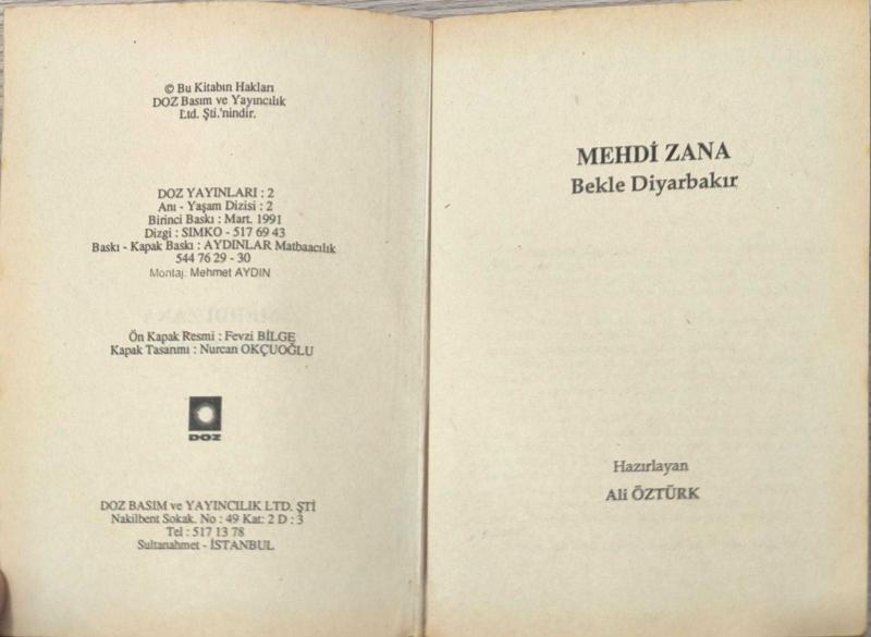 Bekle Diyarbakır – Mehdi Zana | 1991 Birinci Baskı | DOZ Yayınları, MEHDİ ZANA tarafından kaleme alınmıştır. Eser ALİ ÖZTÜRK editörlüğünde hazırlanmıştır. Kitap 1991 yılında DOZ tarafından [İSTANBUL] yayınlanmıştır. Bekle Diyarbakır – Mehdi Zana | 1991 Birinci Baskı | DOZ Yayınları adlı eser Türkçe dilindedir.