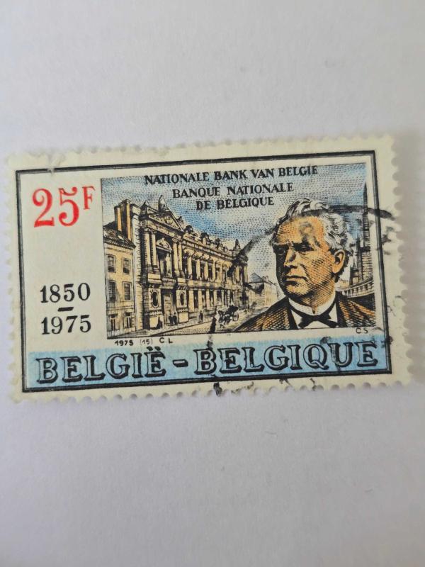 Ülke: Belçika (BELGIË - BELGIQUE). Değer: 25F (25 Frank). Konu: Belçika Ulusal Bankası'nın (NATIONALE BANK VAN BELGIË - BANQUE NATIONALE DE BELGIQUE) kuruluşunun 125. yıl dönümü (1850-1975). Tasarım: Pulun üzerinde Belçika Ulusal Bankası'nın eski binası ve muhtemelen Banka'nın tarihinde önemli bir figür olan bir portre (bir erkek büstü) yer almaktadır. Emisyon Yılı:Pul üzerindeki "1850" ve "1975" tarihleri, 125. yıl dönümünü göstermektedir. Bu nedenle, pulun 1975 yılında çıkarıldığı anlaşılmaktadır.
