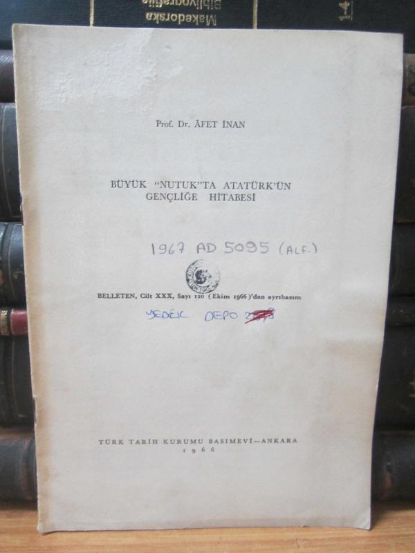 Kitap İçerisinde - Atatürk'ün büyük Nutkundaki tarafından yayınlanmıştır. 6 sayfadır. Belleten Cilt 30 Sayı 120 (Ekim 1966)'dan Ayrıbasım - Afet İnan - Büyük Nutuk'ta Atatürk'ün Gençliğe Hitabesi adlı eser Türkçe dilindedir.