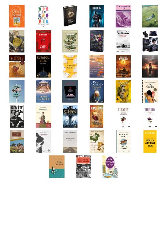 Ben Bir Ağacım - Bilmeceler - Bülbül Kapanı 4 (Ciltli) - Cambaz - 7 Tutsak 1 Ölü - Don Quijote 2 - Doğa Yürüyüşleri - Erythrai Kehaneti - Firuzan - Gitme Gül Yanakların Solar - Karanlık Masal - Kardeşimin Hikayesi - Kaybolmuş Ruhlar Sarayı - Senteria’nın Varisi (Ciltli) - Kleopatra - Kutadgu Bilig (Ciltli) - Küt Oynayan Kadınlar - Kütüphaneyi Kurtaran Kedi - Küçük Annem Tezgül'üm - Kırık Ruhun İzleri - Mobil - Noel Ruhu - O Aşk Dinmedi (Ciltli) - Portobello Cadısı - Safran Sarı - Saç Örgüsü - Semaver - Siyâsetnâme - Sohren - Sultanı Öldürmek - Tolstoy Bütün Eserleri 14 - Tolstoy Bütün Eserleri 3 - Tufandan Önce - Villon'un Karısı - Yaralarım Aşktandır - Bütün Şiirleri - Yaşam Aynasını Kendine Çevir - Yeryüzü Çocukları 2 - Atlar Vadisi - Yolun Gittiği Yer (Bez Ciltli) - Çizgide Bir Kukla - İstanbul’un Köşe, Bucağı - İşte Hayat