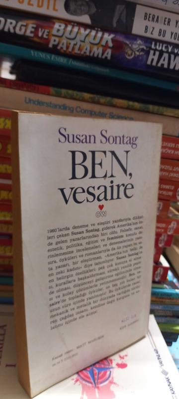 1960larda deneme ve eleştiri yazılarıyla dikkatleri çeken Susan Sontag, giderek Amerikanın en önde gelen yazarlarından biri oldu. Felsefe, estetik, politika, eğitim ve feminizm konulu incelemeleri ve denemelerinin yanısıra öyküleri ve romanlarıyla da ün yapan bu usta yazarı, bir eleştirmen Amerikanın belki de en zeki kadını diye tanımlamıştı. Susan Sontagın en belirgin özellikleri, pek çok konuya birden el atması, kurallara başkaldırması, sürekli yenilik peşinde koşması, kolay çözümlerle yetinmemesidir. Ben, Vesaire adı altında topladığı bu öyküler, on beş yılı bulan uzunca bir süreç içinde yazılmıştır. Bu öykülerinde yazar, mekanik ve metalik bir dünyada varlığını sürdüren çağdaş insanı, kendine özgü kurgusu ve anlatımıyla ele alıyor.