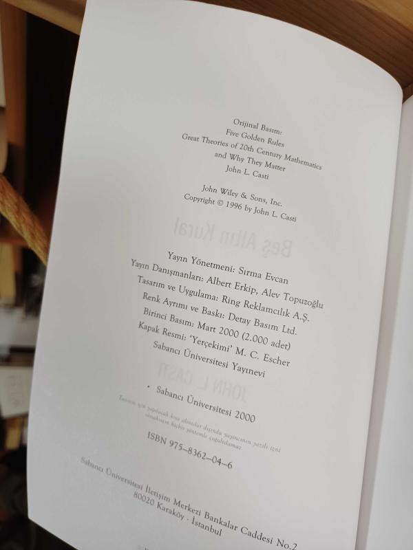 Beş Altın Kural ( 20. Yüzyıl Matematiğinin Önemli Teorileri ), John L. Casti tarafından kaleme alınmıştır. Kitap 2000 yılında Sabancı Üniversitesi tarafından [İstanbul] yayınlanmıştır. Bu baskının çevirisi Nermin Arık tarafından yapılmıştır. 219 sayfadır. Beş Altın Kural ( 20. Yüzyıl Matematiğinin Önemli Teorileri ) adlı eser Türkçe dilindedir.