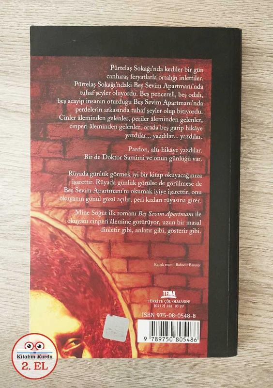 KİTAP 2.EL'DİR Kondisyon: 10 / 10 ---------------------------------------- Pürtelaş Sokağı'nda kediler bir gün canhıraş feryatlarla ortalığı inlettiler. Pürtelaş Sokağı'ndaki Beş Sevim Apartmanı'nda tuhaf şeyler oluyordu. Beş pencereli, beş odalı, beş acayip insanın oturduğu Beş Sevim Apartmanı'nda perdelerin arkasında tuhaf şeyler olup bitiyordu. Cinler aleminden gelenler, periler aleminden gelenler, cinperi aleminden gelenler, orada beş garip hikaye yazdılar... yazdılar... yazdılar. Pardon, altı hikaye yazdılar. Bir de Doktor Samimi ve onun günlüğü var. Rüyada günlük görmek iyi bir kitap okuyacağınıza işarettir. Rüyada günlük görülse de görülmese de Beş Sevim Apartmanı'nı okumak iyiye işarettir, onu okuyanın gönül gözü açılır, peri kızları rüyasına girer. Mine Söğüt ilk romanı Beş Sevim Apartmanı ile okuyanı cinperi alemine götürüyor, uzun bir masal dinletir gibi, anlatır gibi, gösterir gibi.